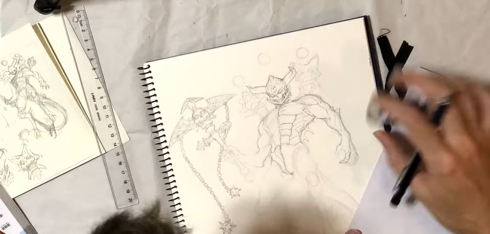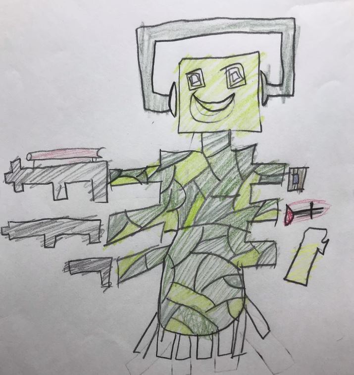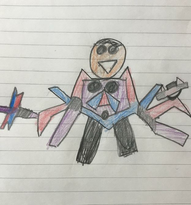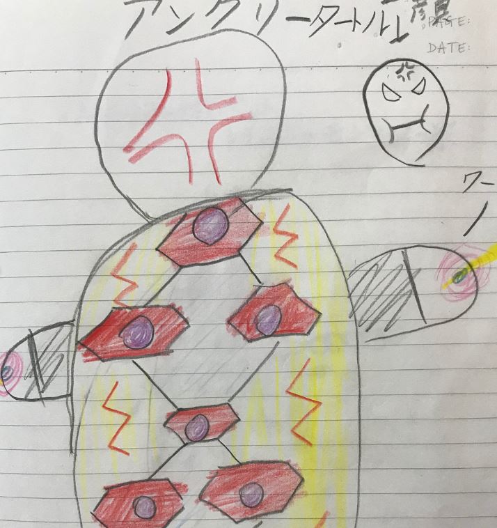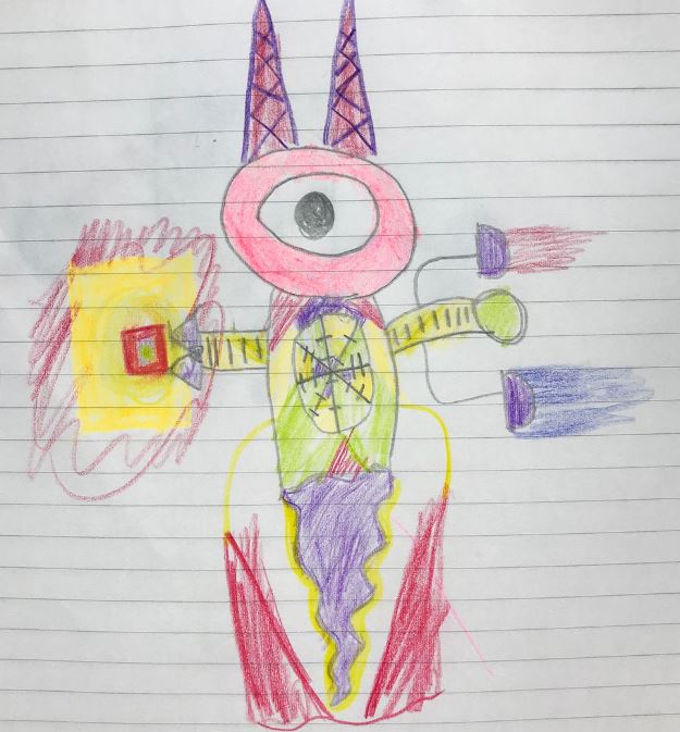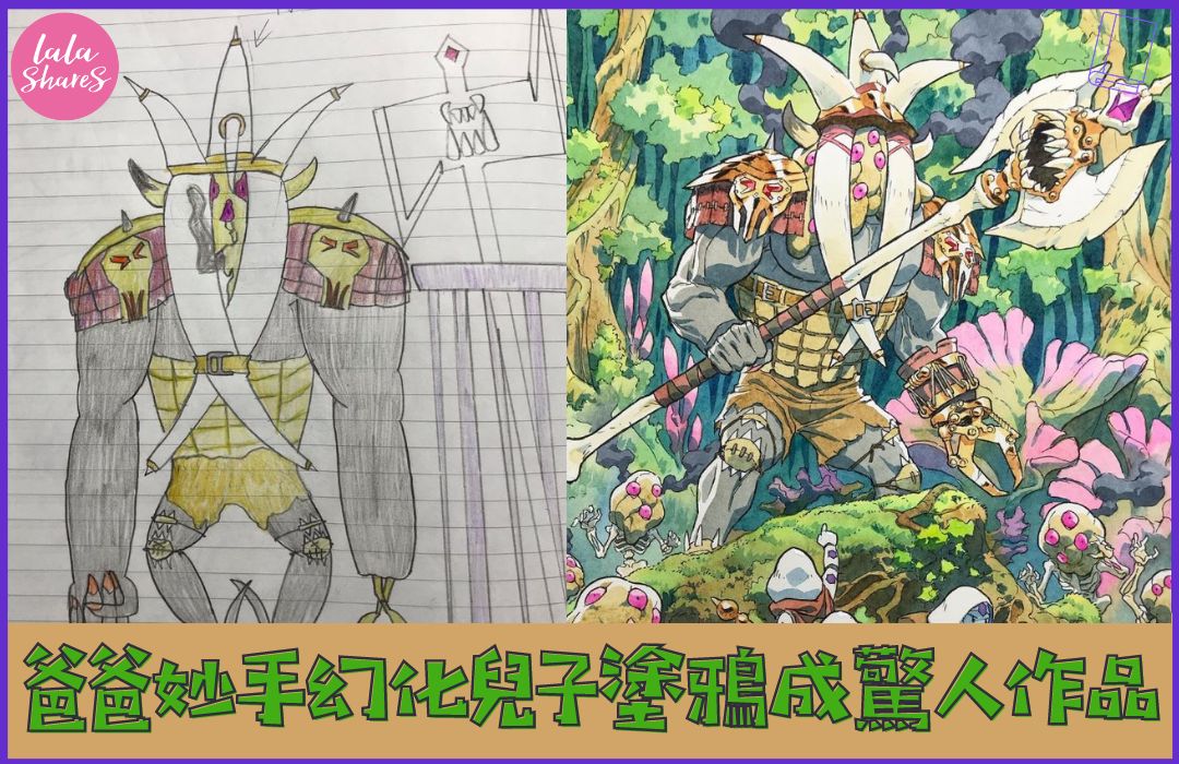 爸爸憑他們的塗鴉,作為升級創作的藍本,把兒子畫中的色彩及細節放大,添加怪獸的武器及再魔化。